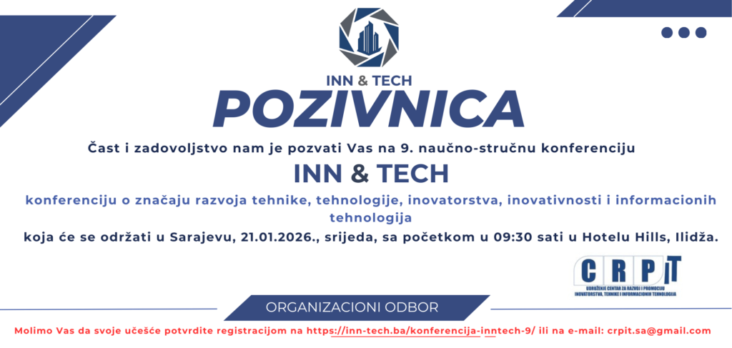 Centar za razvoj i promociju inovatorstva, tehnike i informacionih tehnologija – CRPIT sa ponosom objavljuje da će se 9. naučno-stručna konferencija INN&TECH održati 21. januara 2026. godine u Hotelu Hills na Ilidži (Sarajevo). Ovaj tradicionalni događaj, koji se već niz godina etablirao kao jedan od najznačajnijih stručnih skupova u Bosni i Hercegovini u oblasti tehnike, …